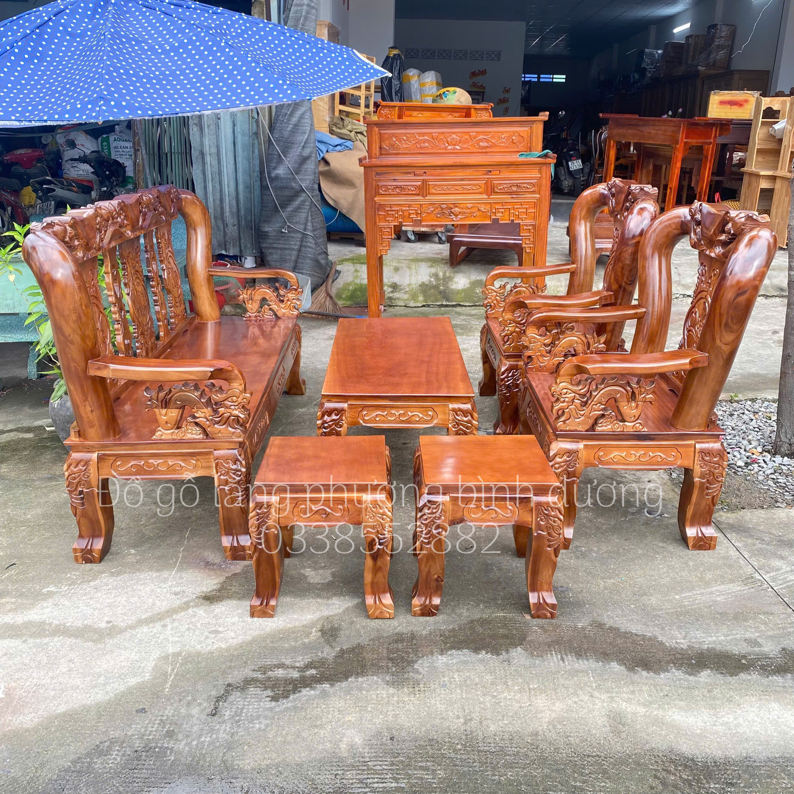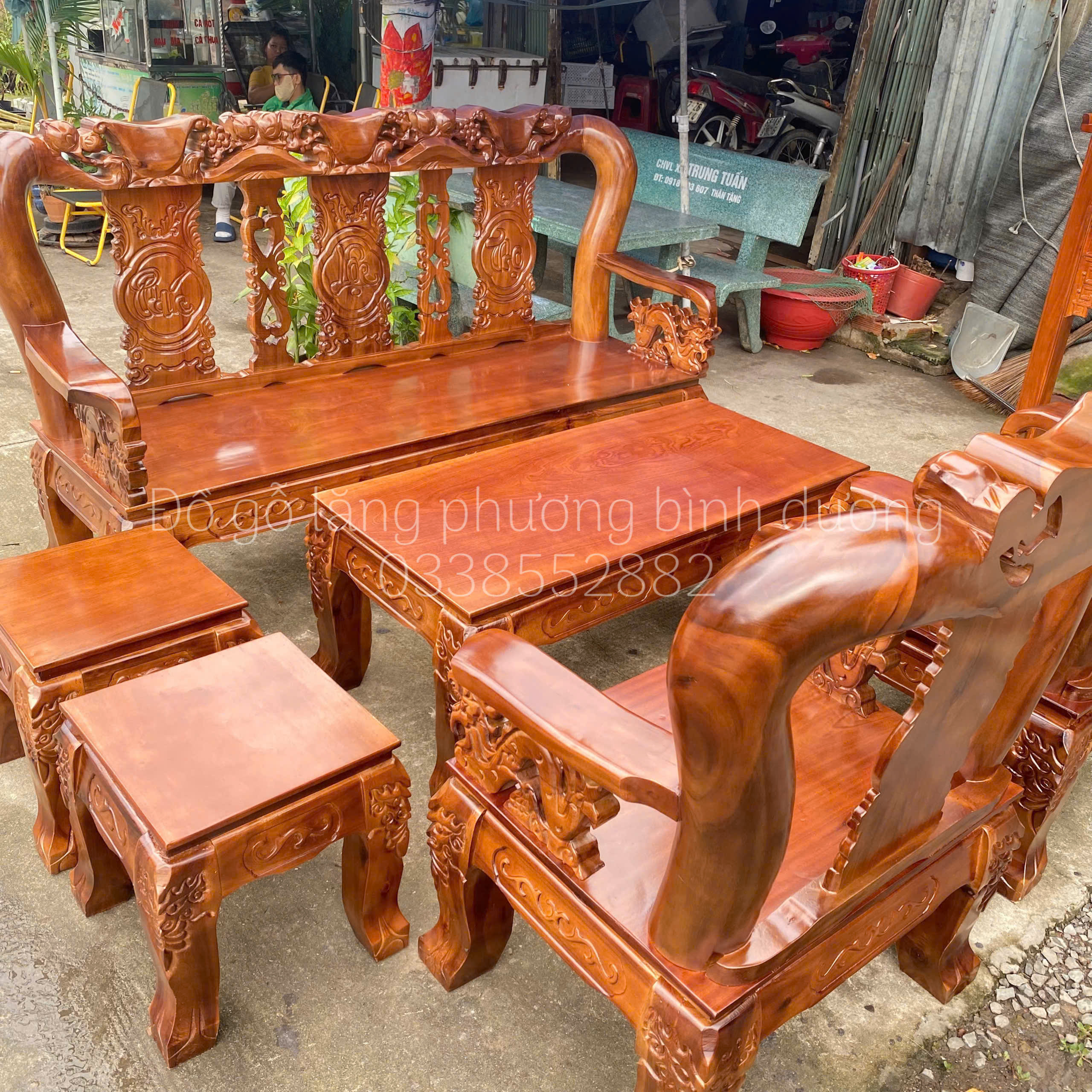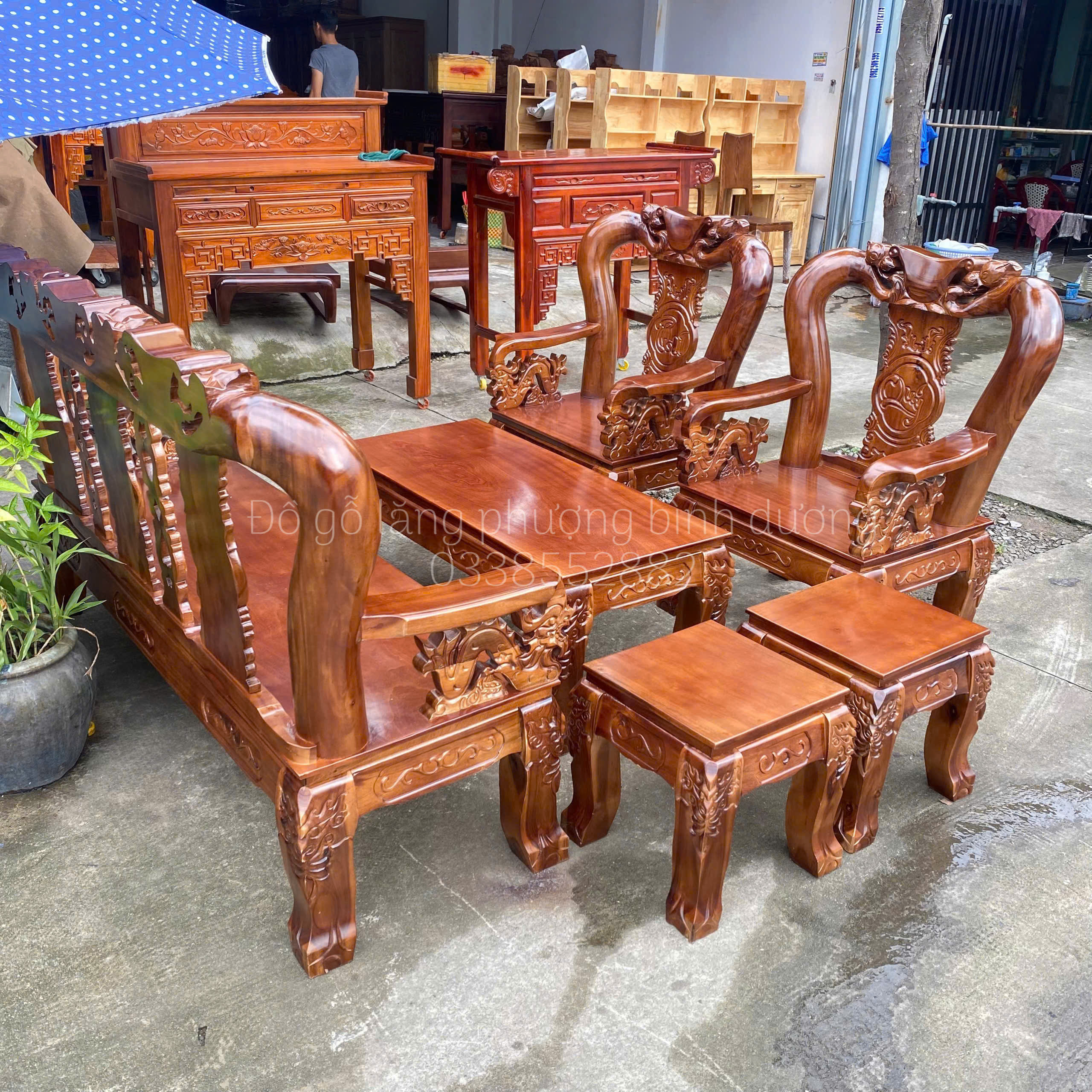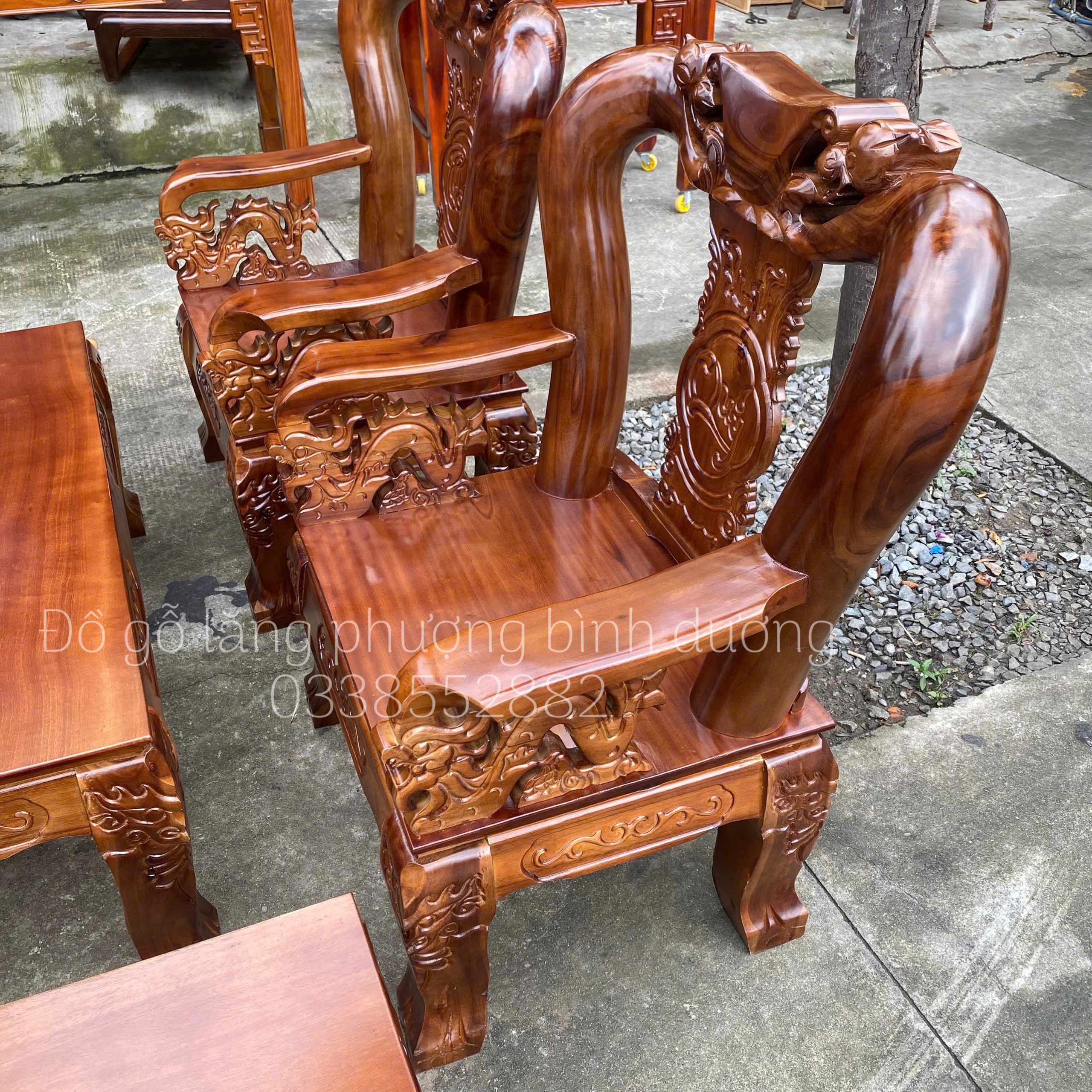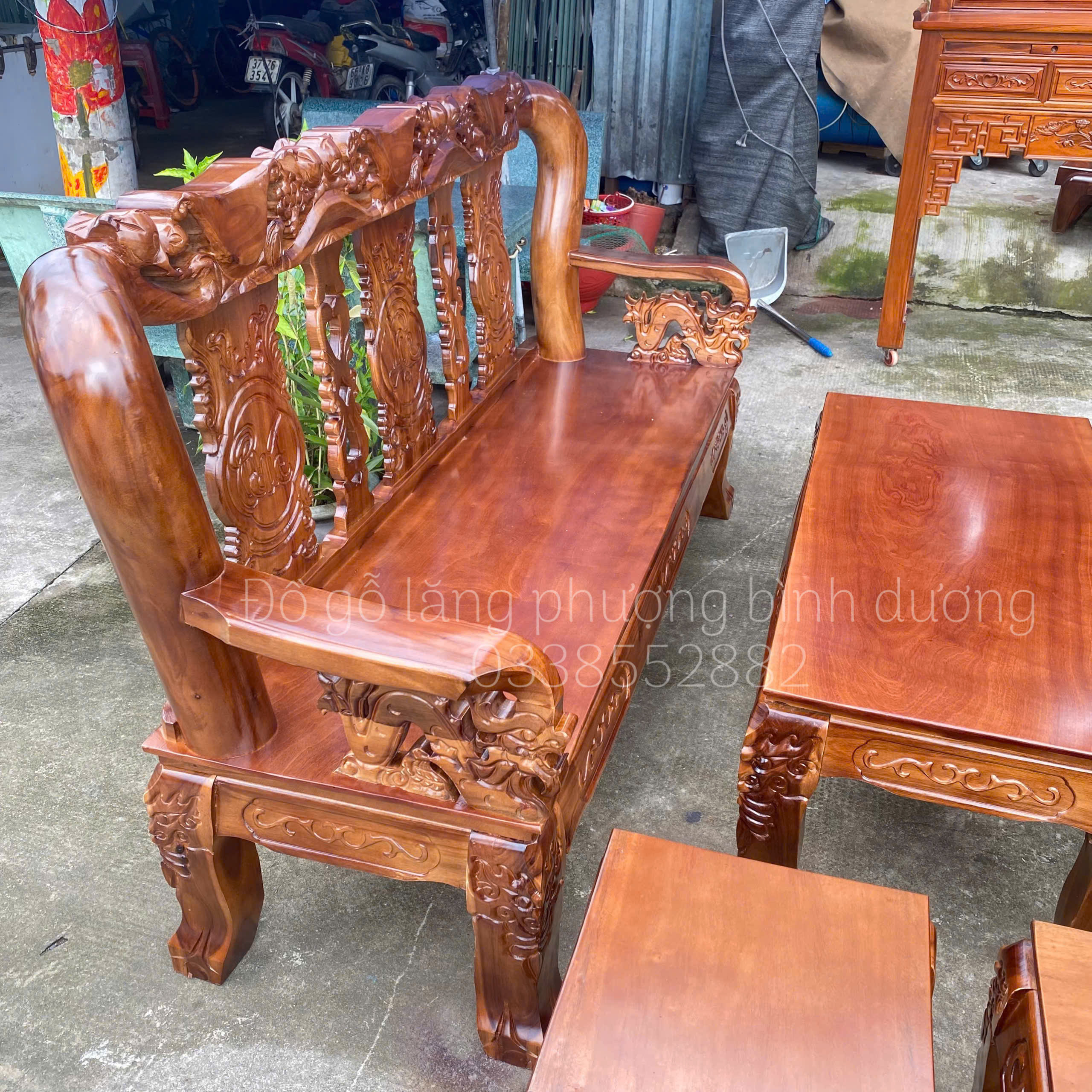 Điểm nhấn của bộ salon nằm ở những đường chạm rồng cầu kỳ thủ công — từ tay vịn, lưng ghế cho đến phần chân đều được đục sắc nét. Thiết kế dáng ghế cao, tựa lưng uốn cong giúp ngồi thoải mái và tạo thế vững chắc cho tổng thể bộ bàn ghế. Mặt bàn rộng rãi, ghế đơn – ghế dài cân đối, phù hợp bố trí trong nhiều kiểu phòng khách khác nhau.