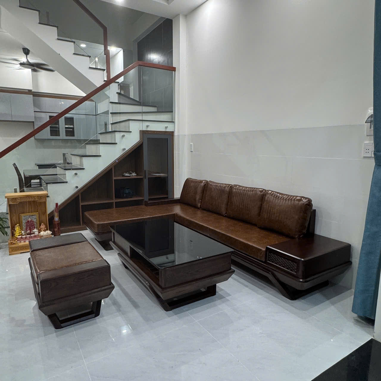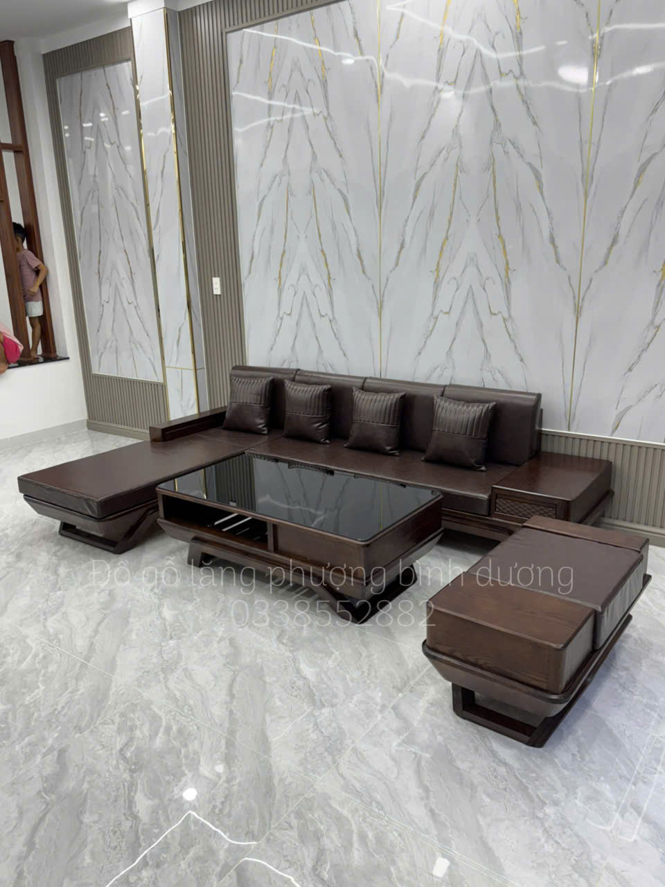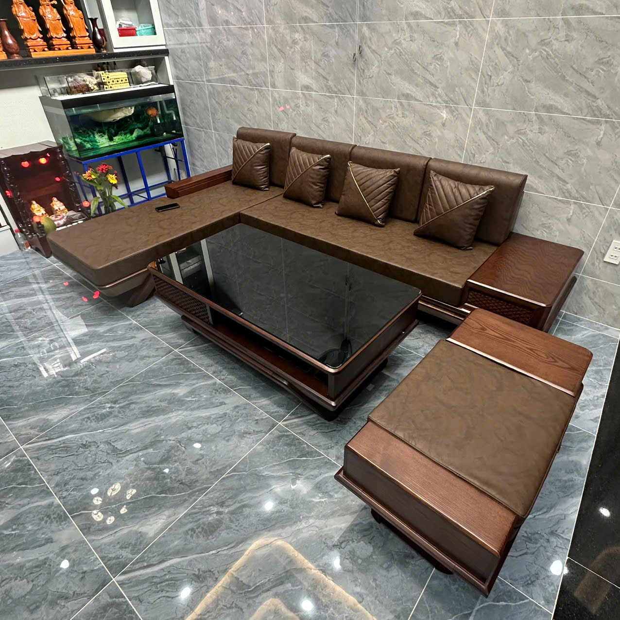 SoFa Góc L Chân Thuyền Gỗ Sồi Nga vế phải ( Bộ gồm 4 món + đệm da kính bàn )